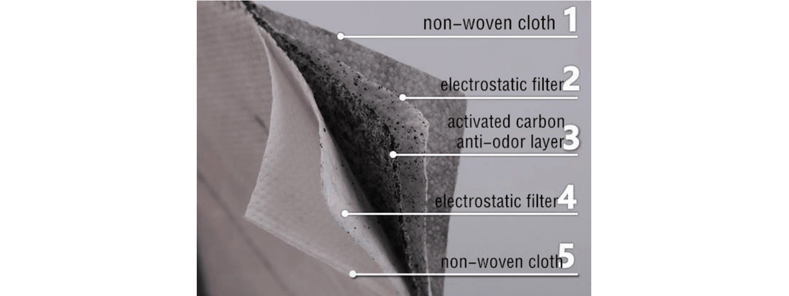 Đặc biệt, khẩu trang 3M 9542 sở hữu thiết kế 5 lớp độc đáo, giúp tăng hiệu quả lọc. Đầu tiên là lớp vải không dệt bên ngoài có chức năng hấp phụ các hạt có hại, bụi và mùi. Các lớp lọc tĩnh điện tiếp theo giúp kiểm soát và lọc các hạt bụi nhỏ hơn 0.3micron. Sau bộ lọc tĩnh điện là lớp lọc than hoạt tính giúp lọc các loại bụi, khử mùi hiệu quả. Cuối cùng là lớp vải không dệt thân thiện với da cho khả năng chống dị ứng khá tốt khi tiếp xúc trực tiếp với da người. Với thiết kế độc đáo này, khẩu trang 9541 giúp bảo vệ tối ưu hệ hô hấp của người dùng trong các môi trường khói, bụi, mùi, ô nhiễm không khí nặng.