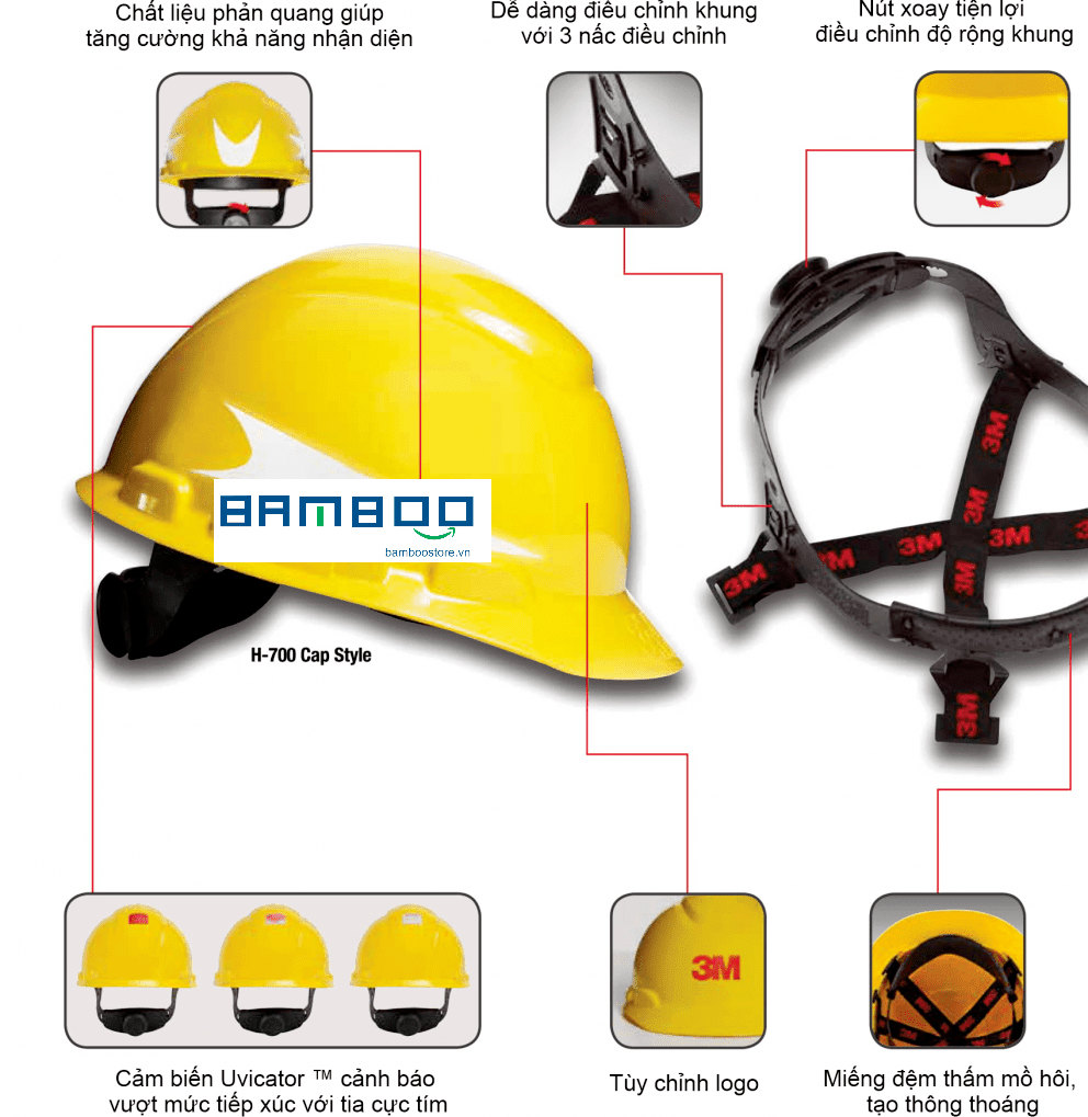 - Hai bên nón có khe gắn, tương thích với các phụ kiện của 3M (chụp tai chống ồn, mặt nạ hàn…).