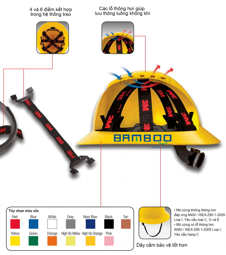 - Tiêu chuẩn: ANSI/ ISEA Z89.1-2009 Type I, Class C, G và E.
